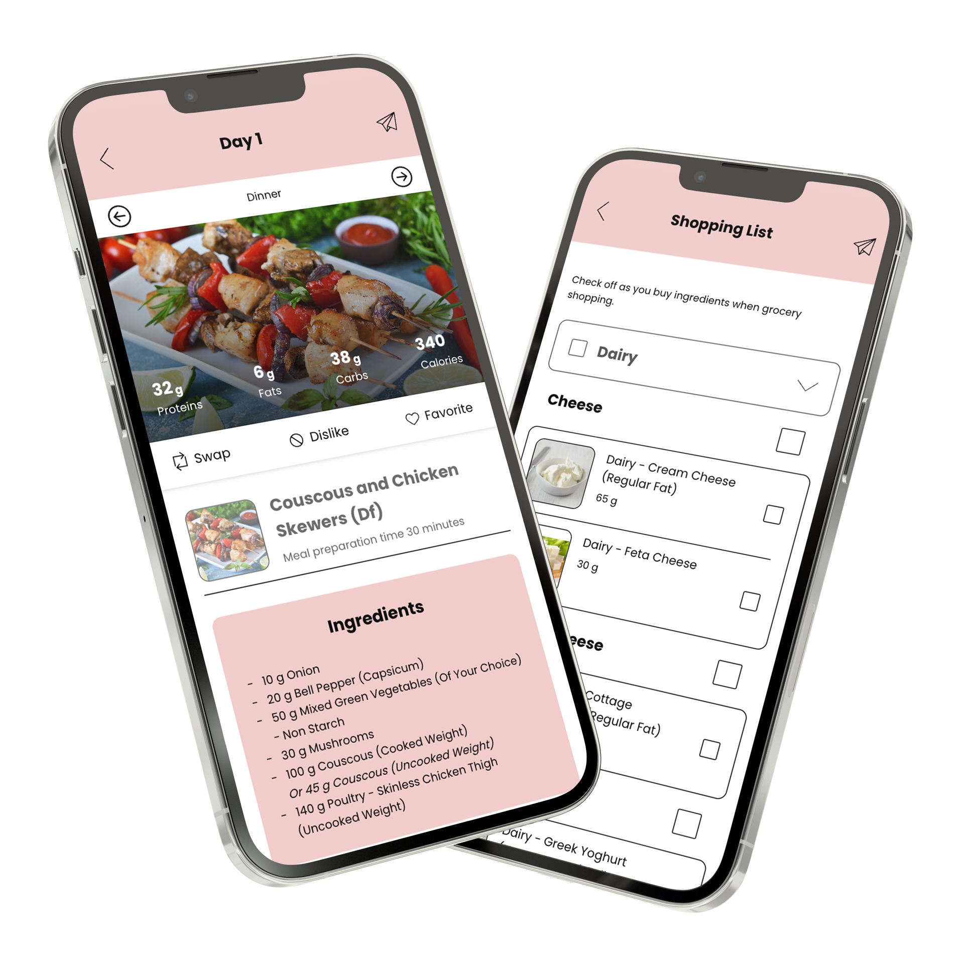 Enjoy meal plans that are fully tailored to you, your goals, schedule, and lifestyle. Updated monthly based on your progress, with options including Meat, Vegetarian, Vegan, Dairy-Free, Gluten-Free, and many more!